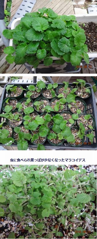 dekotanさんが送ってくださったタネを蒔いたマラコイデスが大きくなり過ぎました。ようやく今日は植え替えました。遅くなった理由は、これからの植え替えで冬場を乗り切れるか心配だったのです。込み過ぎているけれどこのまま春まで持たせようかな…と考えたりして。いろいろやってみなければ耐寒性が判からないので植え替えてトンネル内で育てることにしました。別のプランターに遅れて種まきしたマラコイデスが葉っぱがなくなって茎だけが目立っていることに昨日気が付きました。慌ててヨトウムシに効くオルトランを散布、今日確かめたら大きな大きなヨトウムシ(と思うのですが)が転がっていました。此方はシネンシスと雲南サクラソウ、ビオラと同じセルトレーで育てました。以前はシネンシスは冬越しできなかったので今年は腐葉土でしっかりマルチングして暖かにしてあげましょう。プリムラのメインはポリアンサです。今年もたくさん育てています。自家採種をたくさん蒔いたので楽しみです。葉っぱが伸びてきたのでカットして日当たりと風通しを良くしました。鉢幅を広げてあげるのがいいのですが、場所がないので我が家流のスペーシングです。いつもご訪問いただきありがとうございます。日本ブログ村ランキング参加中です。よろしかったらクリック↑して応援してね!