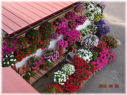我が家の軒下ガーデンは各種素材の植木鉢やプランターなどの容器を並べて造っているコンテナガーデンです。 一般的にコンテナーガーデンとは「コンテナを庭に見立てた花作り」といわれていますが、 我が家の軒下ガーデンはコンテナをひとつの庭に見立てる方法ではなく、コンテナをいくつか集めて庭を造るという方法です。そのため、私が作るコンテナは単色植え、同種類のものが殆どです。それは、単植の方が管理がしやすいこと、多くの植物を必要としないことも理由ですが、なんといっても自由自在に庭を創り変えるという楽しさがあります。 組み合わせを代えたり、高低に変化をつけたり、パーゴラやラテイス等を利用したり、組み合わせをいろいろ愉しみ、花たちの舞台となる軒下を創意工夫できます。その工夫で一番大切にしているのは色合いや種類の統一感です。今日のお庭の様子を高いところから撮りました。高いところのプランターのかけ替えやテラコッタの移動がだんだん負担になってきて気になってもなかなか模様替えができないのですが夫が並び替えてくれました。お庭のメインフラワーとカラーを決めて統一感を出すようにしています。先日まではサフィニアレッドがメインでしたが、只今のメインフラワーはサフィニアローズになりました。サフィニアローズと同色のお花をひとまとめにします。白い色のお花を取り入れて調和させます。濃い色のお花ばかり並んではちょっと鬱陶しいので隣や近くにホワイトのお花を置くと雰囲気が和らぎます。レッドと濃いピンクの中間にホワイトがあるのでいい感じです。仲良しの色合いをまとめます。ブルーとイエローはお互いの色が引き立ちあってその存在が際立ちます。淡いサフィニアのイエローやホワイト、やさしいピンクのショックウェーブをまとめたので優しい色合いのホッとするコーナーになりました。色は点ではなく面にして飾るようにしています。ここはインパチェンスのホワイトだけの場所です。初夏にはこの状態ですと真っ白になるのですが、秋にはあまり期待できません。もう少し、咲いてくれると思うのですが夜間の気温が10℃を下回るのも間もなくです。いつもご訪問いただきありがとうございます。日本ブログ村ランキング参加中です。よろしかったらクリック↑して応援してね!