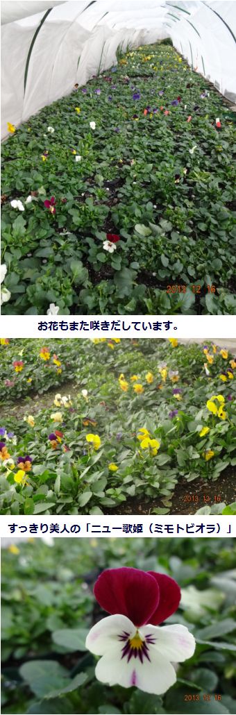 最高気温3.4℃ 日照時間も6時間、今日は思いがけず好天に恵まれました。今夜はクリスマスイヴ、静かな夜です。当地ではクリスマスもお正月も雪がないというのは珍しいことではないのですが、ここ2,3年は年末は特別寒い日々が続き、雪もたっぷりのホワイトクリスマスでしたので、雪のないクリスマスは物足りないという感じでしょうか。お出かけされる方たちは暖かなイヴをお過ごしください。 皆様のところはいかがでしょうか。少しだけ花摘みが残っていたビオラたち、お天気が良かったので全て終了しました。これで不織布トンネル内のビオラ、パンジー、ポリアンサの年内のメンテナンスは終わりです。花摘みとピンチを繰り返してきたのでみんなふっくらしてきました。また、年が明けから2月いっぱいは花摘みを繰り返しながら3月の作業開始を待ちます。これからが冬本番、トンネルの中で元気に過ごしてくださいね。今年も12月1日から「はこだてクリスマスファンタジー」が開催されております。いつもご訪問いただきありがとうございます。日本ブログ村ランキング参加中です。よろしかったらクリック↑して応援してね!