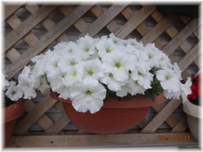 実生「イージーウェーブ ホワイト」昨年の7月31日の画像です。我が家では7月初めごろからたくさんのペチュニアが咲きだします。今年もその時期にたくさんのペチュニアが咲くように定植とピンチを始めました。定植は鉢に一株、長いプランターは2株がよいようです。オレンジクィーンは初めての実生ペチュニアなので株張の程度が判りません。たち性ということなのであまり横に広がらないかもしれませんので他のペチュニアよりも小さめのプランターに植え込みピンチしました。どのペチュニアも5号ポットで大きな苗に育て、この時期に定植をします。早い時期に大きな器に植え込み過湿で失敗した経験があるからです。いつもご訪問いただきありがとうございます。日本ブログ村ランキング参加中です。よろしかったらクリック↑して応援してね!