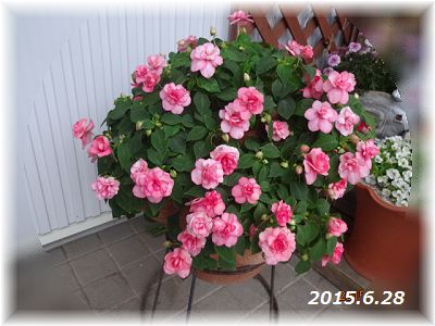 フィエスタ「ピンクラッフル」の一株植えです。まだ大きくなっていませんがお花は次々に咲きだしてきました。我が家のサマーガーデンのレギュラーメンバーのインパチェンスの記録です。毎年、八重咲きのカリフォルニアローズと実生のインパチェンスを育てます。カリフォルニアローズ「フィエスタ」のウオールバスケット仕立てとストローハットの植え込みです。もう一度ピンチが必要なようです。ストローハットの方はこのまま咲かせようと思います。ストローベリーポットに植え込んだカリフォルニアローズ2種類です。だいぶ広がってきましたが、このあたりでもう一度ピンチしたほうがいいのですが・・・どうしようか迷います。此方は実生のインパチェンス、ウオールバスケット仕立てです。頼りない苗だったのですが、今のところは皆元気に育っています。蕾がいっぱい、バスケットのスリットが見なくなる位広がってくれそうです。いつもご訪問いただきありがとうございます。日本ブログ村ランキング参加中です。よろしかったらクリック↑して応援してね!
