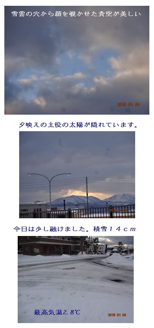 朝焼けが美しく広がりました。こういう朝はかなり冷え込むのですが、6時48分が最低気温マイナス8.2℃でした。テラスに出るのは辛いので撮らなかったのが残念でした。午後になってから外出。日中もマイナス気温でしたので足元が滑るのを気にしながら散歩がてら買い物に行き、緊張して歩いたせいか疲れてしまいました。そのような訳で、昼寝が長引いてブログに取り掛かったのは食事がすんで遅くなってから。簡単に思い出して画像加工ができると思っていたのがうまくいかずとうとうギブアップ、今日は諦めて、「ブログ休みます」で終わっちゃおと思いましたが、以前に作った加工を載せて今夜はごまかしちゃうことにします。インフルエンザがはやってきたようです。今日は夕刻にスタッフの方が体温計をもって居室訪問、私は36.5℃でした。明日から散歩はマスクをしてお出かけすることにします。皆さんもご用心なさってください。日本ブログ村ランキング参加中です。 にほんブログ村 いつもご訪問いただきありがとうございます。