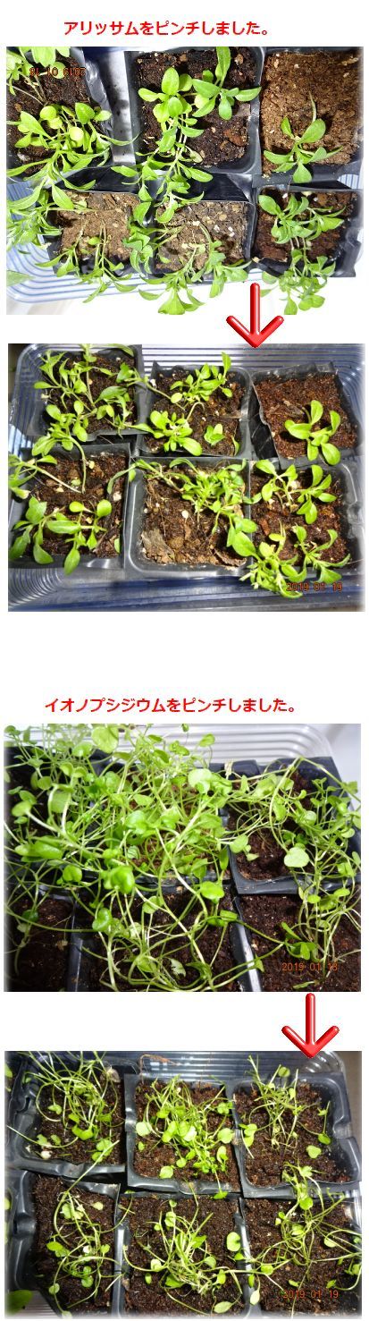 昨日アップした発芽苗のうち、アリッサムとイオノプシジウムをピンチしました。これはピンチと言うよりはカットという方が適切ですが、何とか少しでも脇芽が出て来てくれると嬉しい。今迄は液肥だけでしたが、様子を見ながら固形肥料も与えた方がいいかなと思っています。下葉が少し黄色っぽくなってきています。6階ホールに現在13個ほどの鉢花があります。私個人の所有と言うよりも、お世話しますと言いながらだめにしてしまった鉢花の替わり(お返しのつもりの鉢)のもので、それが結構あるのです。また、以前から此処に在った鉢などもあって、全くの個人所有じゃないもののお世話は緊張します。時々、在ったはずの鉢が?と思うことがあります。違う場所に移してスタッフの方がお世話してくださっているのです。時々良く視て記憶に残すのですが、それがどうも自分自身が信用できなくなっています。そのために時々写真を撮っていますが今日はこのようにアップしてみました、日本ブログ村ランキング参加中です。 にほんブログ村 いつもご訪問いただきありがとうございます。