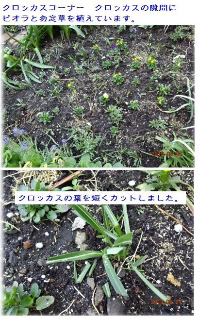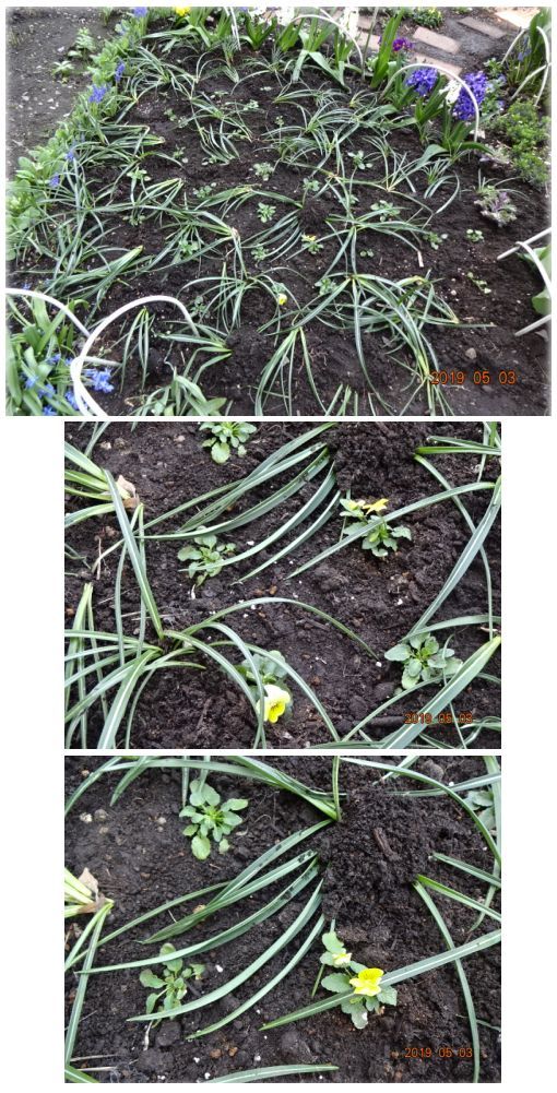 クロッカスがかなり早い時期に花期が終わってしまいました。この後、少し寂しいクロッカスコーナーです。でも光合成のこともあって葉をカットしてしまうわけにはいきません。そこで今回1月11日にタネ蒔きして育っているビオビオラを植えることにしました。このビオラが育ってお花が咲くころにはすっかり葉っぱも枯れてしまう頃でしょう。次は花いっぱいになったビオラのお花が終わってからはどうしようかな?今年はいろいろお試しなので、イメージが膨らみますがいろいろなイメージに惑わされることも楽しいだろうと思っています。ストック、イオノプシジュームのガーデンデビューです。ストックは2本だけ、あとは★になってしまいました。イオノプシジュームは最初のタネ蒔き育苗は失敗、2度目でこれだけ育ちました。冬場のタネ蒔き育苗はなかなか難しいです。イオノプシジュームは複数本の芽が一緒に絡まって育っています。多年草や球根の成長具合の記録です。暖かになったり寒くなったり、気温の変化が激しく、なかなか大きくならないなと思っていましたが、植え込んだ当時の画像と比べてみるとずいぶん大きくなっていました。植え込んだのは4月20日です。日本ブログ村ランキング参加中です。 にほんブログ村 いつもご訪問いただきありがとうございます。