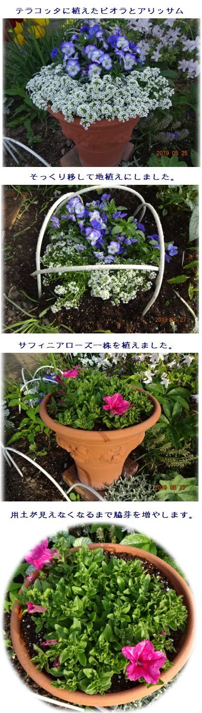 今年のサフィニアは旧宅時代に戻って一株をテラコッタでこんもり咲かせることが出来るのを楽しみにしています。今日はその作業の下準備です。まずは株つくり、あまり大きくなるとポットから出すのが大変なので地植えにしてスコップで掘り上げられるようにしました。でもうまくいくかな??私の大好きな小さなお花です。日本ブログ村ランキング参加中です。 にほんブログ村 いつもご訪問いただきありがとうございます。