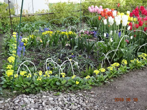 昨夜はものすごい雷と雨、今朝早くに花畑をチェック。風も強かったので心配でしたが、チューリップも倒れることなく、午後になって日が当たりだしたら、元気に咲きだしました。こちらは「ブルンネラ」と「カンパニュラ」先日、tottokoさんのブログでブルンネラが余りに逞しいのでマイガーデンのブルンネラをお披露目しました。多年草を引っ越すときに急いだのと私の性格のいい加減さとのダブルの禍で花たちに迷惑をかけています。手前のプリムラも植え込んだその上を何度も踏みつけてしまって春になって姿を現したのに植え替えせずにいたらこんなにちびちゃんのまま、でも蕾がいっぱいです。この施設でのガーデニングは多年草や宿根草を植えていますが、これは旧宅ではない経験です。今迄はコンテナガーデンでしたから、春に芽が出てくるのを楽しみに待つということもほとんどありませんでした。チューリップの植栽も大きなコンテナガーデンマムも鉢の中から冬至芽が出てくるのを待っていました。たった唯一の地植えはカサブランカだけでした。ここへ来てからの地植えガーデン、春に多年草の芽が出てくると、今まで味わったことのない感動ともいえるほどの歓びが湧いてきます。日本ブログ村ランキング参加中です。 にほんブログ村 いつもご訪問いただきありがとうございます。
