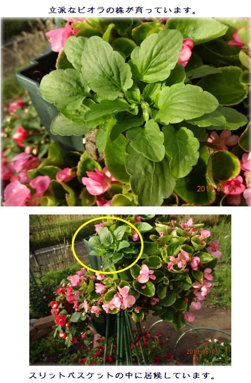 スリットバスケットから出てきたビオラの芽、どこから飛んできたの?こんなに大きくなってしまいました。そのうち、この居候の方が目立ってしまいそうです。負けるな! ベコニアたちよ!暑い日が続いたので元気に再生に向けて張り切っています。後、5日経ったらどうなるかしら、楽しみです。昨秋、花街道から失敬してきたマリーゴールドのタネをあちこちにばらまきました。出てきて出てきてびっくりするほどたくさんで今度はその処分に困ってしまいました。雑草を取り除き、あちこちに移植始めました。*マーガレットではなく、マリーゴルドです。ごめんなさい元気な花たちの様子です。日本ブログ村ランキング参加中です。 にほんブログ村 いつもご訪問いただきありがとうございます。