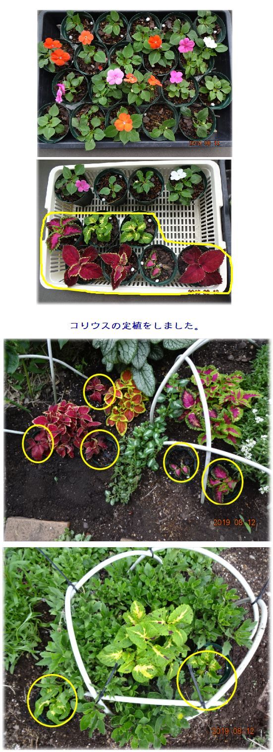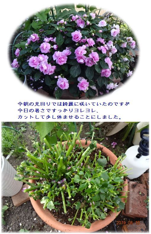 今日の最高気温は20.9℃、その時刻は00:02、日中はそれよりも低いということです。最低気温は18.9℃でした。前日に比して10℃高く成ったり、低くなったりですからお花たちも大変です。今日の日照時間はゼロ時間でした。昨日しな垂れていた花たちも今日は涼しかったので元気に回復しました。ポットがないのでただ今7号サイズのスリットポットで育てています。ほんとは口径の広い鉢で育てた方が形が整うのですが鉢類はできるだけ購入しないようにしているのである物で間に合わせて使っています。場所の確保の計画が出来なかったので今年のマム育てはまずかったです。8月一杯は伸ばして9月になったら花芽を育てることにします。市役所の外郭団体が行っている市内の緑化事業の一つに花苗の無償提供があります。学校や公共施設、市内の花壇植栽などあちこちの美化事業を行っています。この施設にも毎年提供され、花苗と野菜苗をスタッフの方が植えています。今年もいろいろなお花を植えていますが、あまりお世話ができていません。今年は雨が少なかったので水やりが不足で花たちが可哀想で少しお世話のお手伝いしました。伸びきったインパチェンスをカットして挿し芽を作りました。いろいろな色のインパチェンスがあるのはそのせいです。ヘブン日誌少し水やりが多いようです。そのためにつるが伸びすぎてしまったようです。日本ブログ村ランキング参加中です。 にほんブログ村 いつもご訪問いただきありがとうございます。