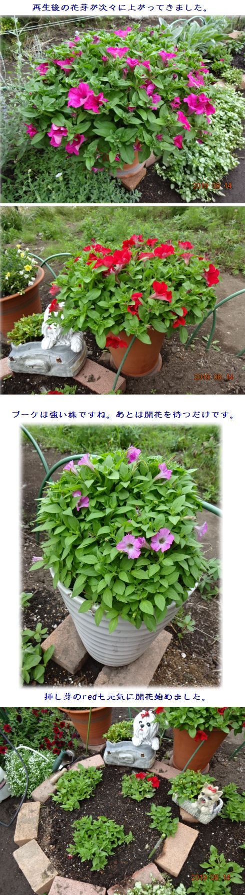 サフイニアブーケが見事に再生しました。そして今日はお花が咲きだしました。こちらのサフィニアレッドは「嬉しい」と「残念」の二鉢です。咲くのを長くと思ってやった私の作戦の失敗例です。雨と暑さですっかり蒸れてしまいました。葉っぱを掻いて風通しを良くしなかったためにこのような結果になってしまいました。(下段)ヘブン日誌日本ブログ村ランキング参加中です。 にほんブログ村 いつもご訪問いただきありがとうございます。
