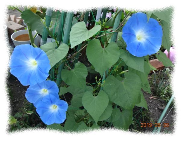 ヘブンリーブルーが4輪も咲きましたこれからはこのお花に会うのが楽しみです。明日はどれくらい咲いてくれるだろうか。カットしてから10日くらいですが、この暑さで良く伸びました。花芽も見え始めたので楽しみです。伸びて、お花の精彩もなくなったのでここらで少し夏休み、バッサリ切ってすっきりさせました。今度咲き誇るのは何時頃かな。日本ブログ村ランキング参加中です。 にほんブログ村 いつもご訪問いただきありがとうございます。