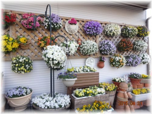 我が家の春はビオラのウオールバスケットをラティスいっぱいに飾り、賑やでした。