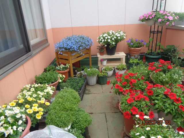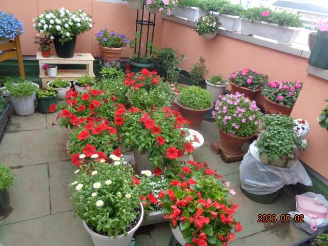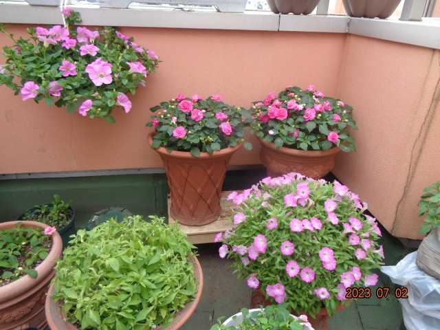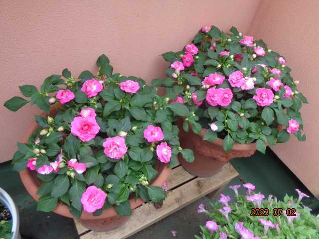 ダブルインパチェンスは直射日光に弱いので、壁の隅になってしまいますが。