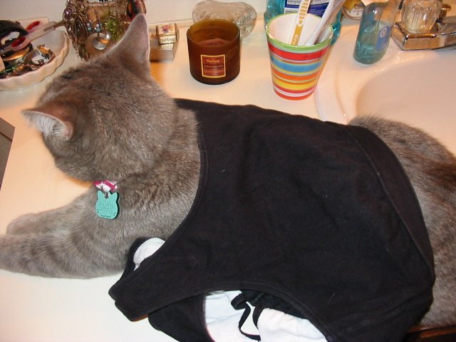 花の今日のファッション ちょっと今日はスポーティーに決めてみました。花は洗濯したての服、タオル等が大好きで(多分匂いが)いつも体を洗濯物にスリスリするのですが、今回は彼女のスリスリの手間を省くために私のスポーツブラ(注:腹巻ではありません)を直接着せてみました、笑。次回はビキニに挑戦!お楽しみに、笑。