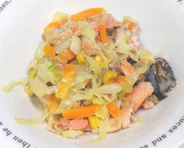 す。今回の具は、キャベツとにんじんを刻んだものと粒コーンを使いました。