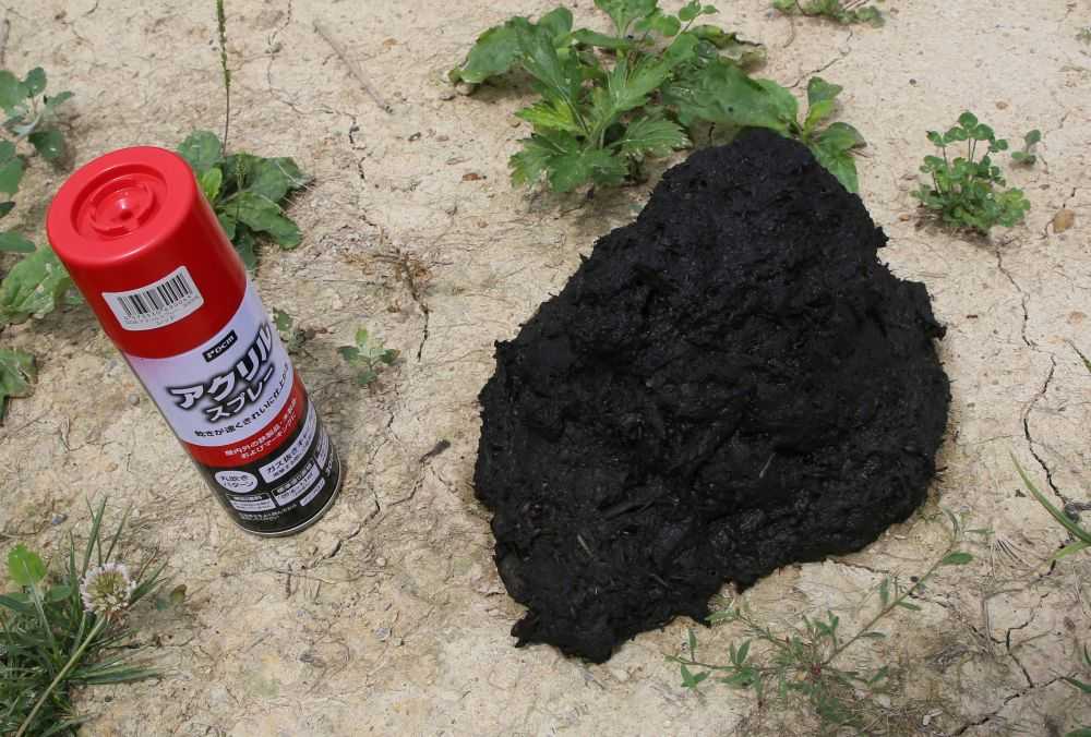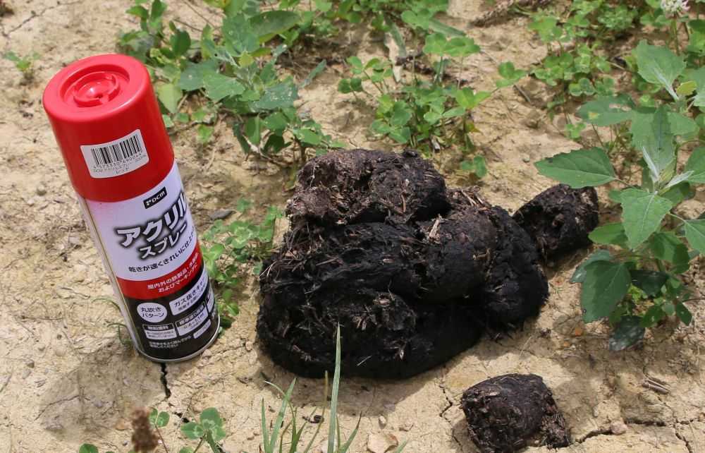 直ぐ近くにコレも未消化で草混じりの糞で珍しく「太い」やつで、スプレー缶と比べると