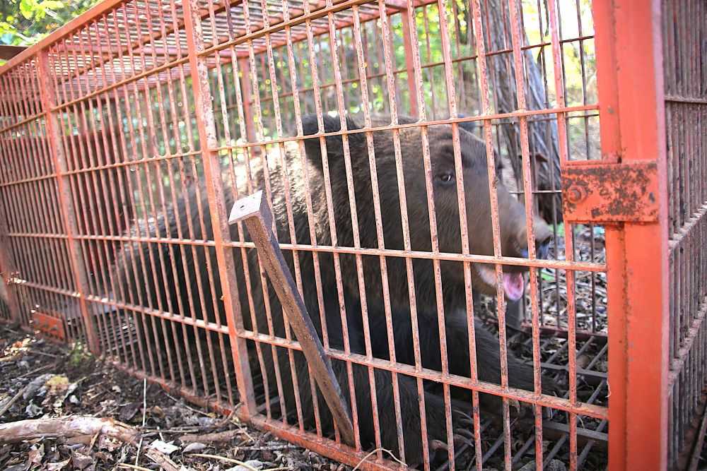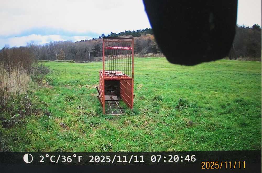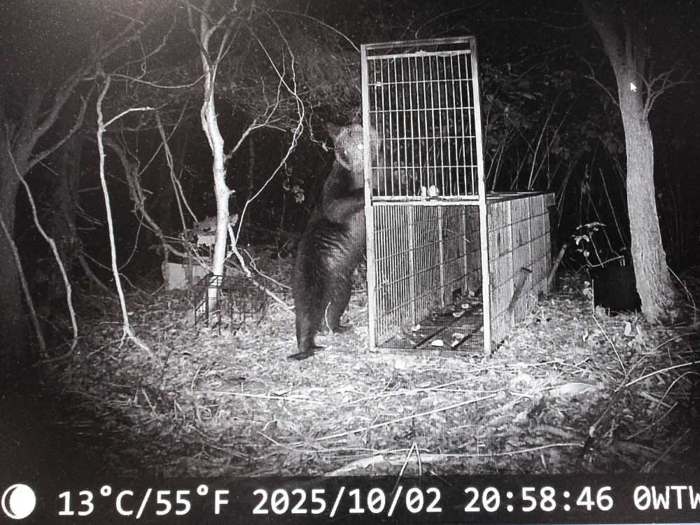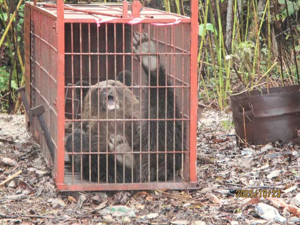 5日にひっくり返された箱わな。設置し直してから2日目の今日、入った体重は300k程でこの周辺に出没しているヒグマでは、2番目くらいの大きさ。まだまだいるぜ