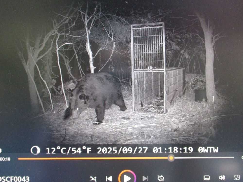 デカいヤツが現れた入るかな入れないかな因みに箱わなの寸法は、入り口幅0.8m 高さ1m 奥行き3.1mです。400k位はありそう