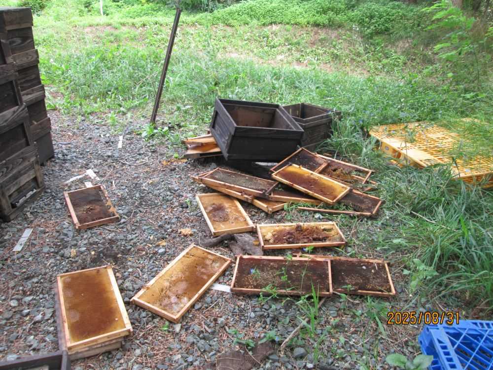 蜜箱に付いちゃったよ多分昨日から今朝に掛けてやられたのだろうがヒグマが養蜂施設の箱を壊して蜜泥棒の証拠写真こんな旨い蜜の味を占めたら、もうどうにも止まらないだろう。即、箱わな設置となりました。