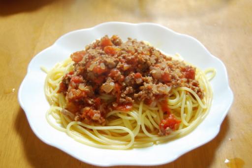 今宵は久しぶりに夕ご飯をアップ合い挽き肉とカットトマト缶があったので、ミートソース♪まず、オリーブオイル大さじ2を熱した鍋に。そこへ、大蒜1カケを4枚位にスライスしていれて香りをだします。香りが出たら大蒜を取り出し、カットトマト3缶を入れます。顆粒コンソメを大さじ2、バジル適量を入れて、中火で煮込み水分を飛ばします。半分ぐらい煮詰まったら火を止めておきます。次に、玉ねぎ中2個みじん切り。今日は娘がお手伝い玉ねぎをみじん切りにしてくれました合い挽き肉400グラムを炒め、味付けに塩胡椒。火が通ったら鍋へ入れ、再び弱火で15分煮込みできあがりこれと平行にパスタを茹で、茹で上がったパスタを皿に盛ってソースをかけてできあがりしかし、パセリが無かったのに気が付いた仕上げにパセリを散らせてと思ったのですが・・・・・