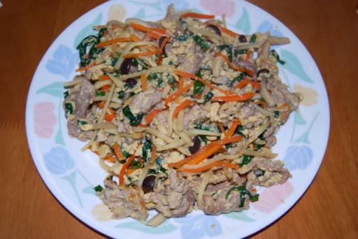 今日は月に2回ある平日休みでした。昨日久しぶりに行ったボウリングの成績が良かったので、午前中また息子と行ってきました。結果は、息子の承諾を得たら後日。さて、今夜の晩ご飯は、ニラ、豚肉、シメジ、人参、筍を炒めて解き卵を入れて絡めました。卵が少なかったかな?5個入れたのですが・・・・それから、胡瓜、ハム、人参、卵の入ったマカロニサラダ明日は出勤時間頃雨が降りそう。バイクで行くか考えないと。