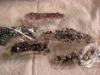 昨日届きました。今は髪を伸ばしている最中なので、コームよりもバレッタのほうが出番が多いと思ったので2個・・・。中身の方は、詳しく名前とか種類がわからないんですが、ロイヤルリボン ¥3360ブリンセスフラワー ¥2480プレミアムリボン ¥2980などが入っていたようです。あとのものは商品ページを見てもわかりませんでした。5個ずつのうち、4個が同型色違い、1個ずつは違ってました。日替わりでつけてもアタマが足りないくらい(^_^;)。一度にキラキラが増えて嬉しいです。