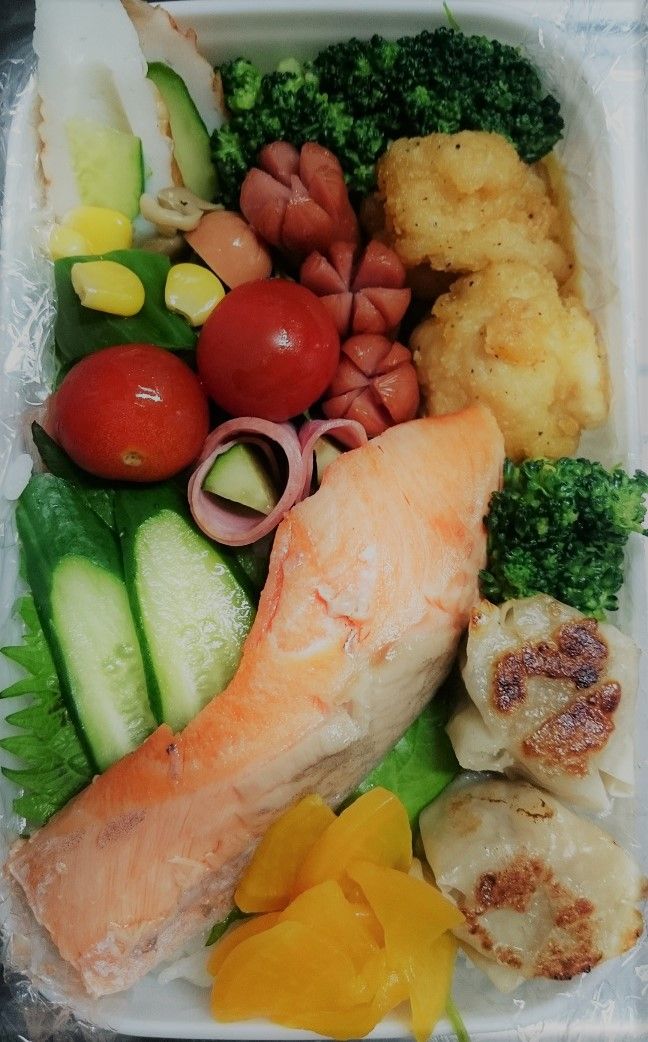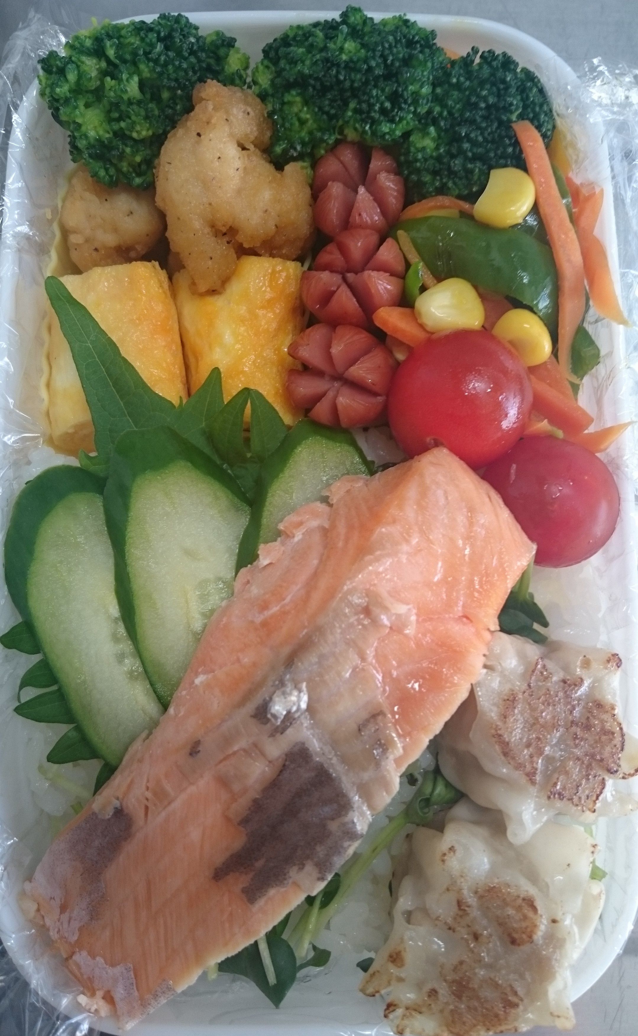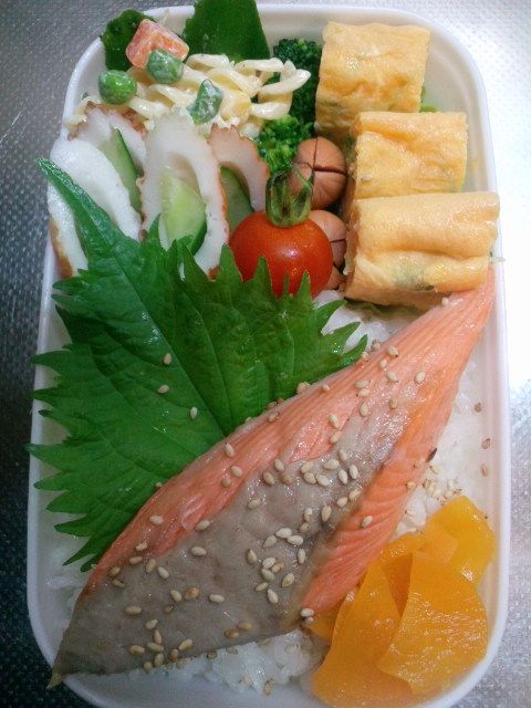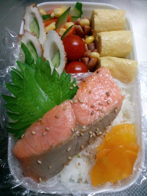 *お弁当作りました*◆鮭(下にご飯があります)◆ちくわ胡瓜◆コールスロー◆卵焼き◆ウィンナーdesign by sa-ku-ra*