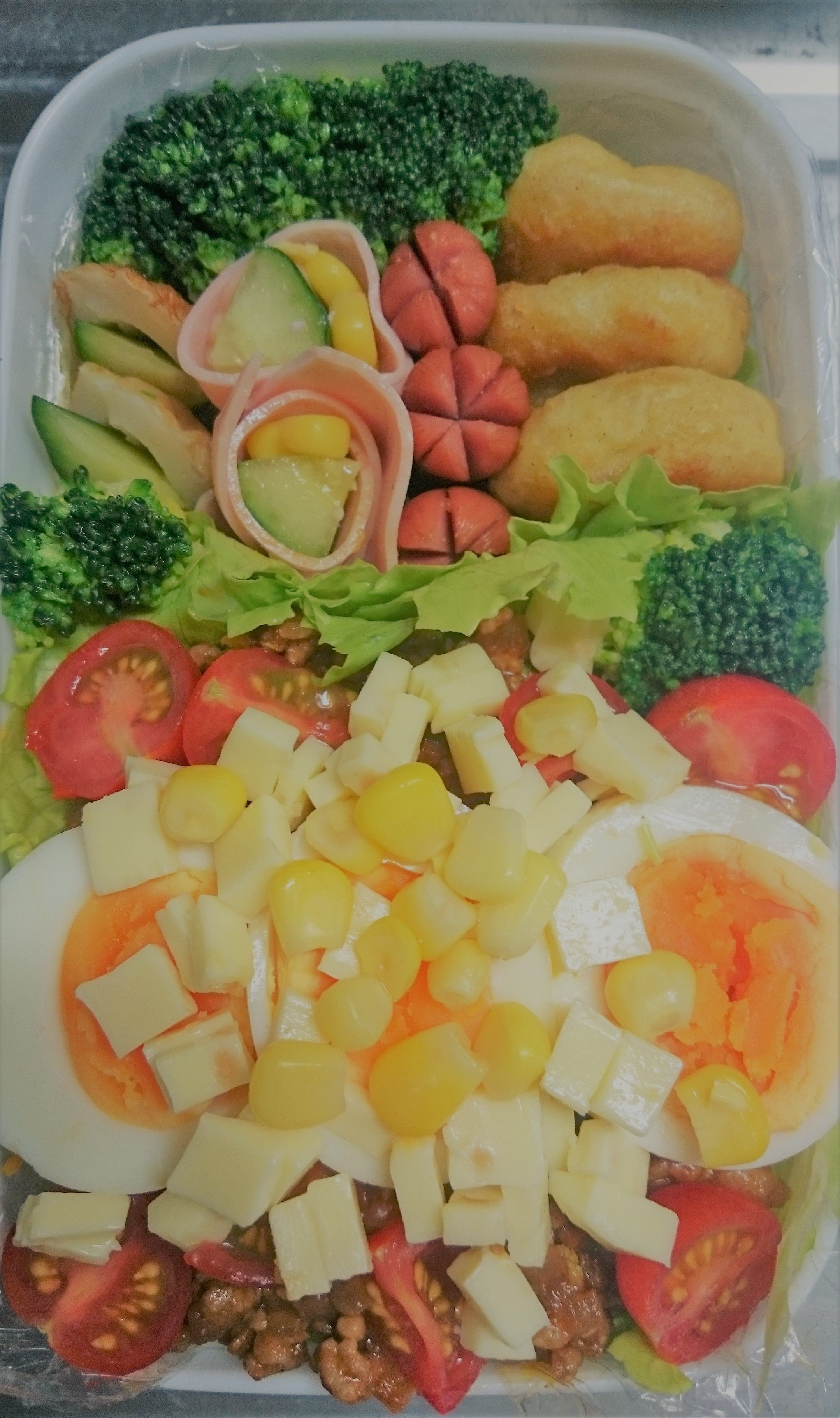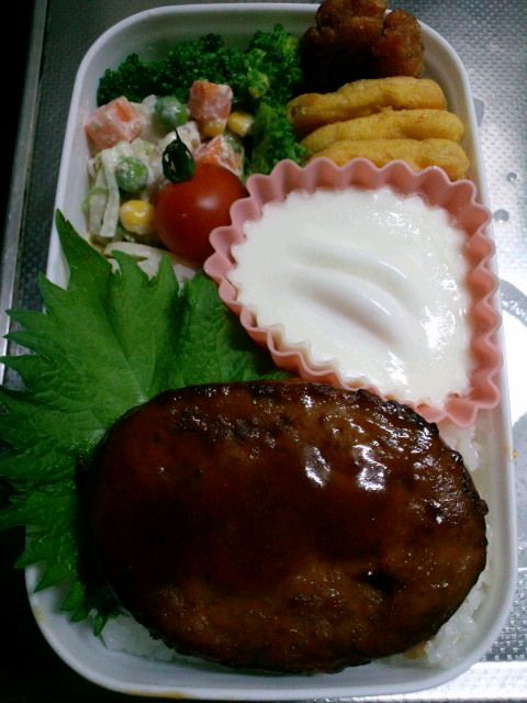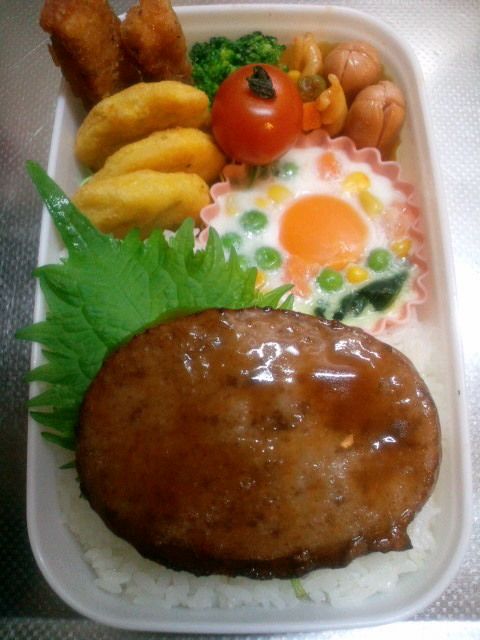*お弁当作りました*◆ハンバーグ(下にご飯があります)◆マカロニサラダ◆ナゲット◆チキンボーン◆卵のシリコンカップ湯せんdesign by sa-ku-ra*