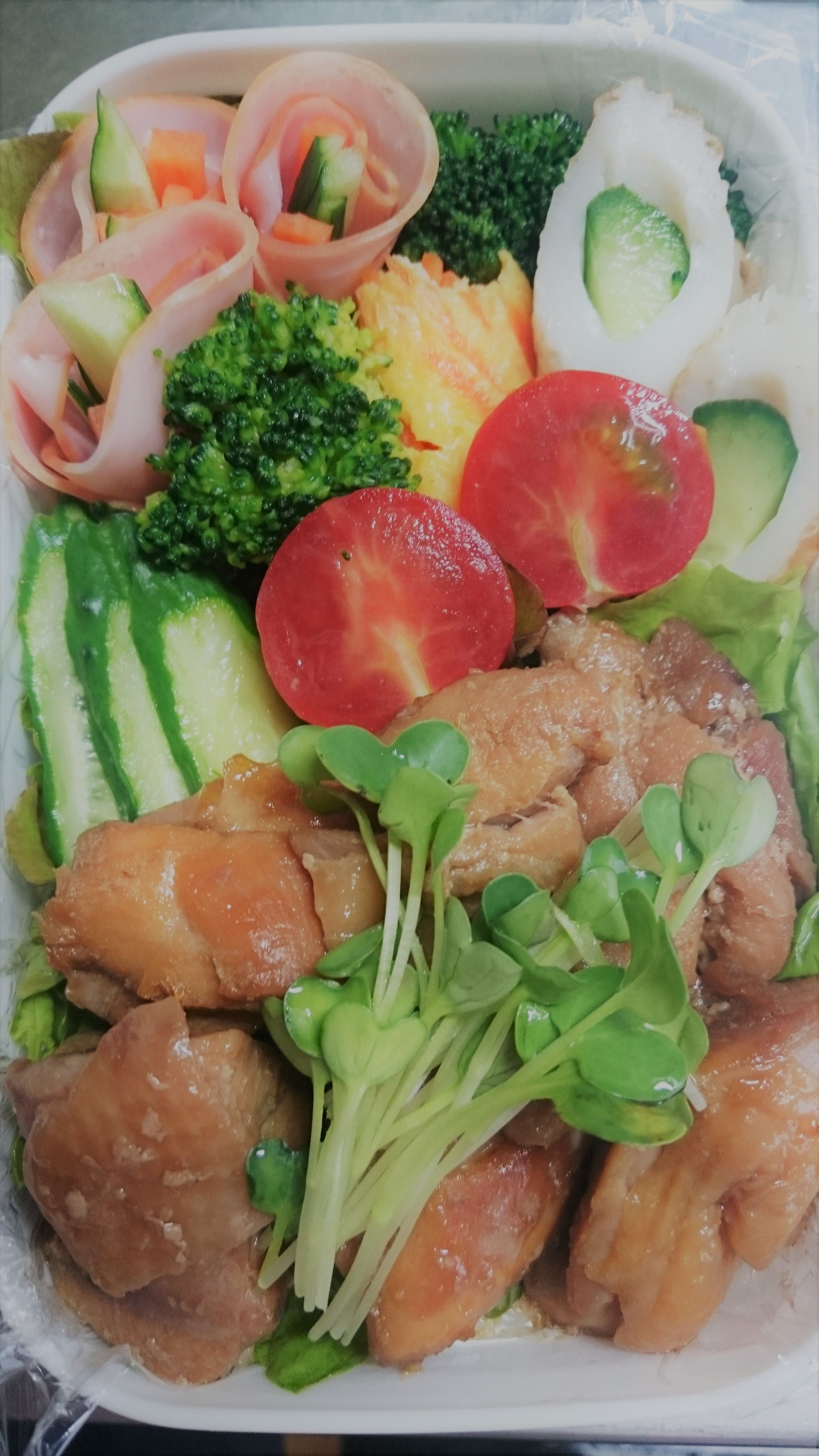 *お弁当作りました* ◆鶏照り焼き(照り焼きの下にごはんがあります)◆人参入り卵焼き◆ちくわ胡瓜◆胡瓜と人参のハム巻きdesign by sa-ku-ra*