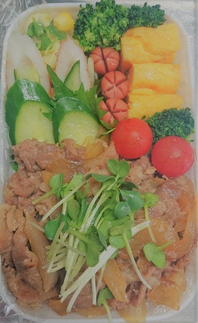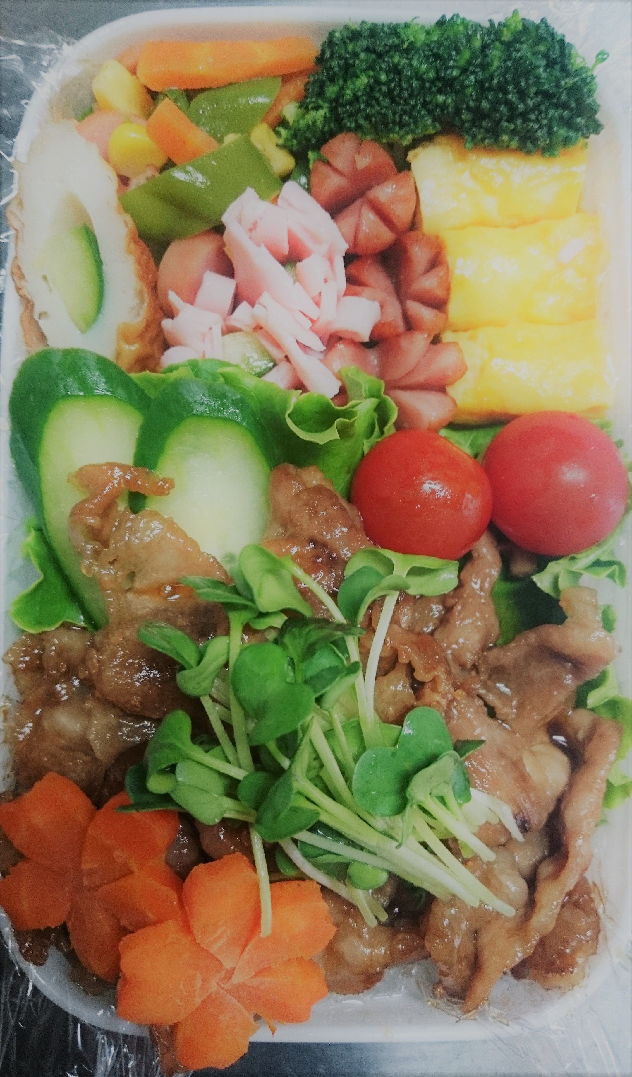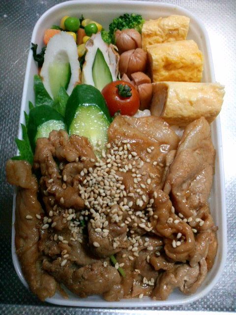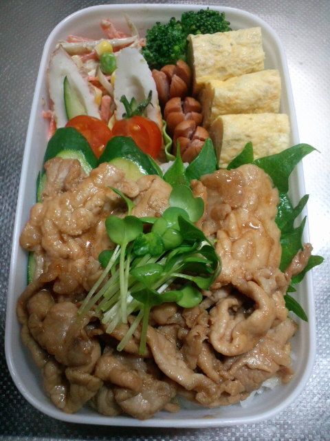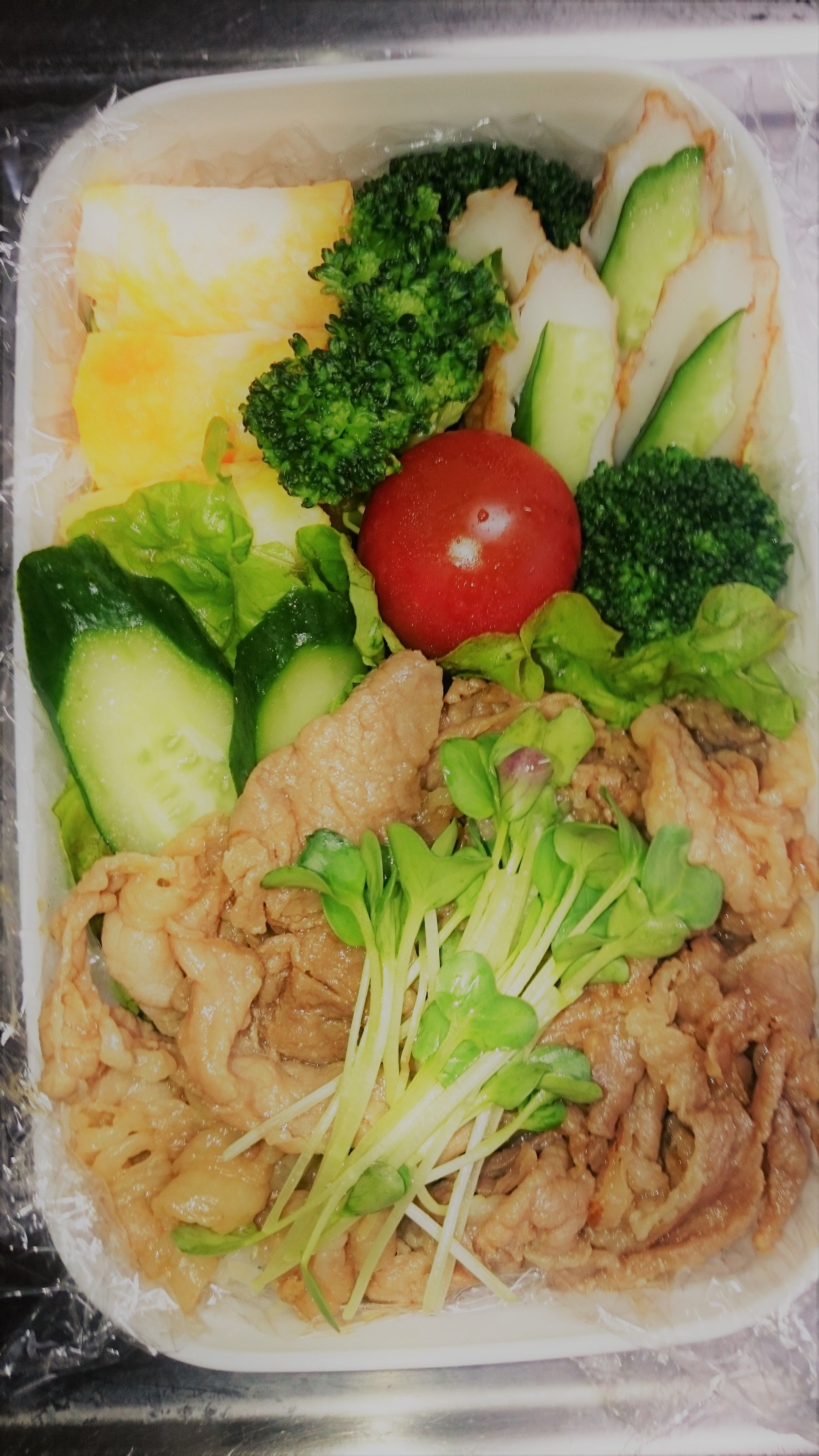 *お弁当作りました*お肉の下にごはんがあります。 ◆豚肉炒め◆卵焼き◆ちくわ胡瓜design by sa-ku-ra*