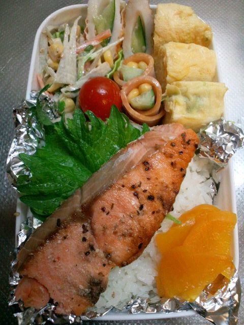 *お弁当作りました*◆鮭(下にごはんがあります)◆ちくわ胡瓜◆ごぼうサラダ◆胡瓜ハム巻き◆卵焼きdesign by sa-ku-ra*