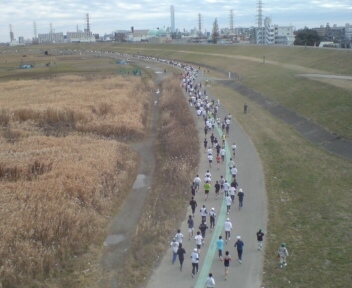 と、いっても応援です。今朝荒川土手へリハビリ散歩へいきました。川岸へ近づいたら、何やら対岸にランナーの群れが飛ばしているのが見えます。トレーニングか、いいなあ・・・と思ってましたが。暫くして気がついたら、ものすごい数のランナー達がず~っとつながっている。もしかして、谷川真理か?と思って、アート鈴木君のサイトを携帯で見たら、やはりその通りでした。しかし、ランニングから遠ざかり、毎月定期購入しているランナーズも最近見ることがなくなったせいか、大会も無縁になってしもうた。笹目橋を渡り、この強風の中頑張っているランナーたちを応援し、刺激だけはいただいて家へ帰り、ベランダでゴムチューブトレーニングに熱が入りました。