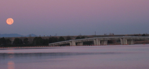 謹賀新年日の出を拝もうと彩湖へ。彩湖管理橋に新年またいでお勤めのお月さんが!荒川土手に沈もうとしています。ご苦労様でした。また今度!そばにいるお人よ、お月さんに乗っちゃいかんぜよ。6時59分頃。明けましておめでとうございます。日の出と彩湖です。土手をちょっと移動。彩湖と幸魂大橋に3つの太陽!!得した気分。反対側には朝日を浴びた富士山。上を見上げると、何と!見事なV字の渡り鳥。バケラッタのO次郎の口にも見える。衰退期を終え成長期へ向かおうとしている曲線?そして朝日へ向かう鴨の親子。そしてそして太陽は今日も富士山へと沈んでいったのであります(ちょっとシャッターチャンスが遅かった)。みなさん、今年もよろしくお願いいたします。今日走行距離 10キロ