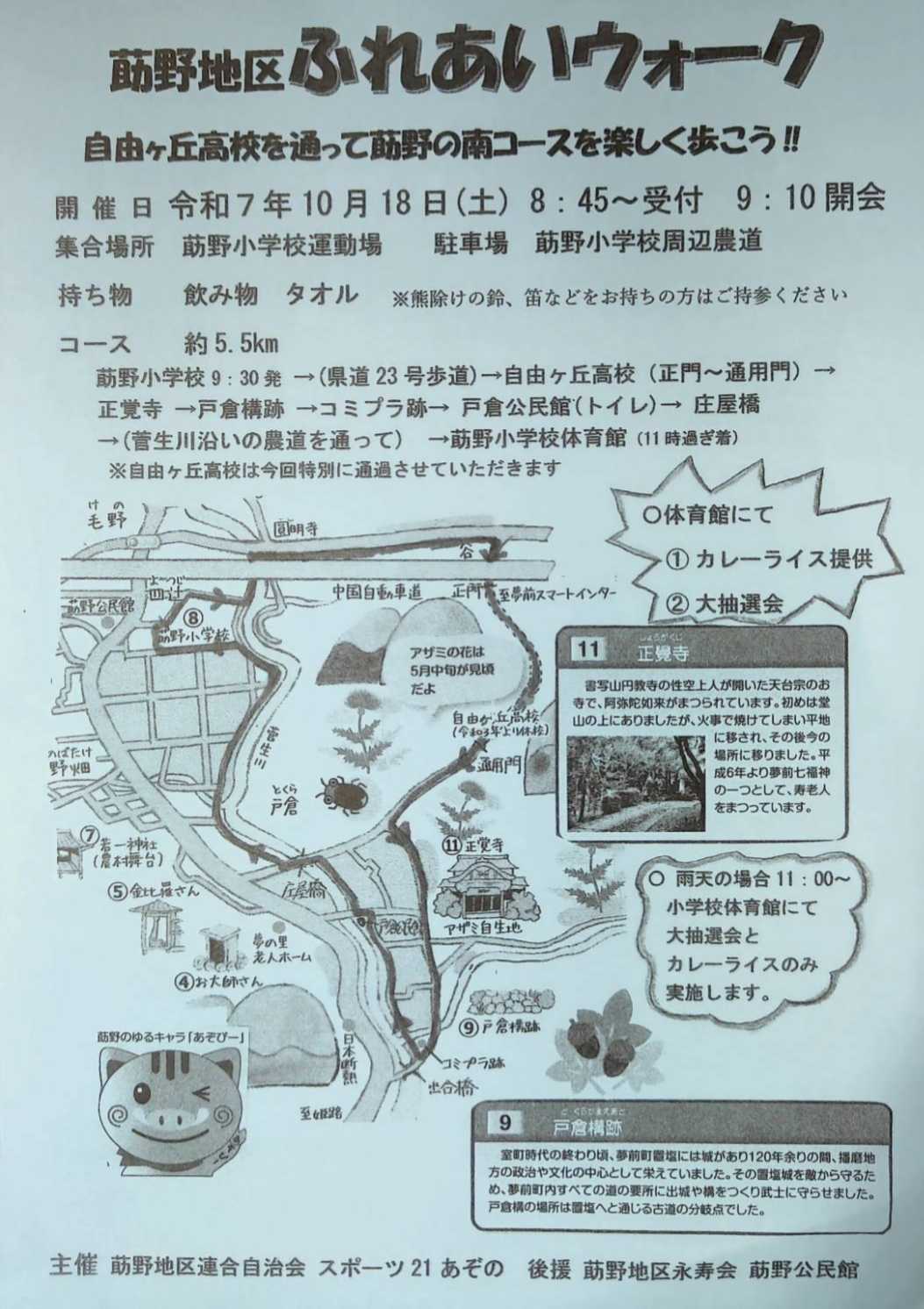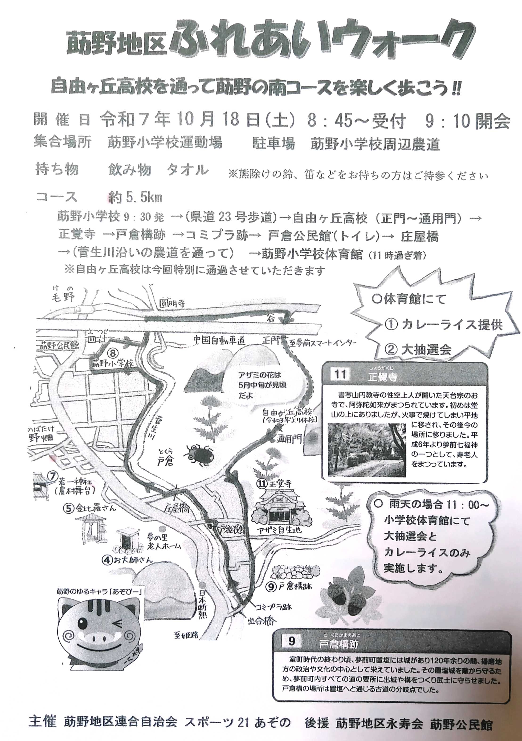 再来週は 「莇野地区ふれあいウォーク」 が開催されます🎉今回はなんと‼️ 初めてのルート 🌸「自由ヶ丘高校を通って莇野の南コース」🌸を歩きますよ〜!🕗 日時:10月18日(土)📍 集合場所:莇野小学校運動場🍛 ゴール後は体育館にてカレーライスの提供&お楽しみ抽選会もあります🎁✨全長約5.5kmのコースを、地域の自然や歴史を感じながらのんびり歩けるチャンス🌳🐞初めての道を仲間と一緒に歩くワクワク感、きっと最高の思い出になりますね😊💕雨天でも体育館で楽しい企画がありますのでご安心を☔みなさんのご参加をお待ちしています🙌#ふれあいウォーク#自由ヶ丘高校#初めてのルート #地域イベント#秋のおでかけ#みんなで歩こう#莇野小#莇野小学校#あぞの小学校#小規模特認校#姫路市立莇野小学校#あぞのしょうがっこう#AZONOELEMENTARYSCHOOL#おいでよ莇野小学校へ#ひめじの学校#探求学習#表現活動#1年生募集中#新1年生募集中#あぞの#あぞぴー#莇野公民館#姫路市夢前町#あぞの応援団#莇野地区連合自治会#姫路市立莇野公民館#あぞの村興しプロジェクト#交通の便がよい#姫路市#azonopro#azono#himeji#azono.yumesaki#azono.special#Azono_Yumesaki#いい街あぞの