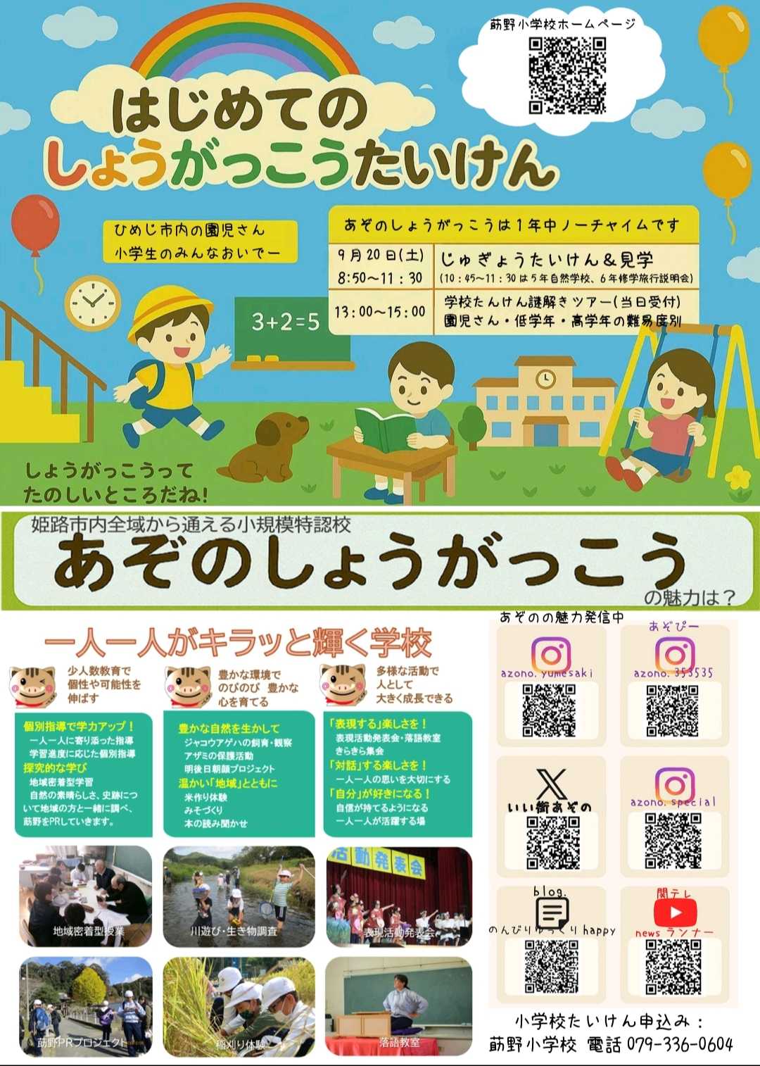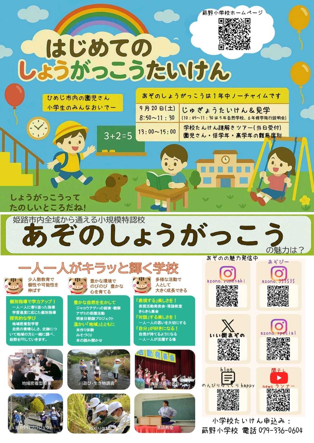 9月20日(土)は、姫路市立莇野小学校でスペシャルな1日🎉【午前】は、5歳児さん、小学生向けの【しょうがっこうたいけん】👧👦「しょうがっこうってどんなところ?」という少人数で魅力的💡なワクワクを体験できるチャンスです🏫✨※体験は教室の都合があるので、事前申込みが必要です📩見学は当日OK👀そして【午後】は…🌟【あぞのまるしぇ】🌟 12:00〜15:30(雨天時は体育館)校内探検しながら謎解きにチャレンジ🕵️♂️🧩 難易度は3段階!年長さんからチャレンジ!さらに、わくわくワークショップやステージ発表🎤パトカーや白バイに乗ったりできちゃう🚍📸親子で楽しめる体験が盛りだくさん!ぜひ遊びに来てくださいね🌈#しょうがっこうたいけん#あぞのまるしぇ#姫路市立莇野小学校#親子イベント#謎解き探検#ワークショップ体験#莇野小#莇野小学校#あぞの小学校#小規模特認校#姫路市立莇野小学校#あぞのしょうがっこう#AZONOELEMENTARYSCHOOL#おいでよ莇野小学校へ#ひめじの学校#探求学習#表現活動#1年生募集中#新1年生募集中#あぞの#あぞぴー#莇野公民館#姫路市夢前町#あぞの応援団#莇野地区連合自治会#姫路市立莇野公民館#あぞの村興しプロジェクト#交通の便がよい#姫路市#azonopro#azono#himeji#azono.yumesaki#azono.special#Azono_Yumesaki#いい街あぞの