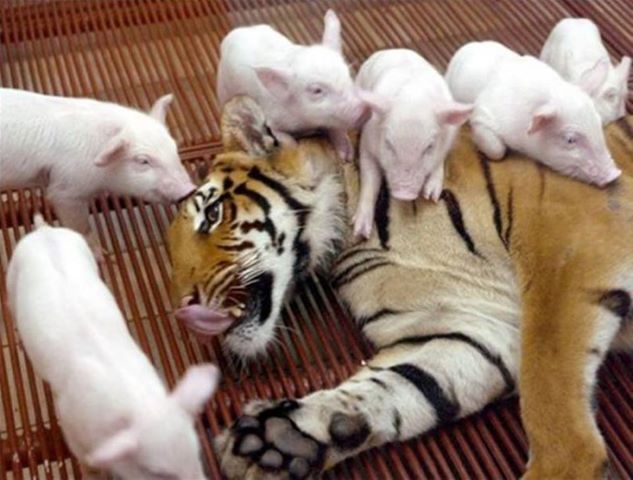 《スゴイと思ったらシェア》さんからシェアしました。 弱肉強食というフレーズが、皆無の《ほのぼのショット》です 子供時代ならでは… と言えるのでしょうか…自然界ではありえない取合せが、描き出す見事な光景 コブタ達が、数で圧倒しているというよりは…子どものトラと、完全にじゃれている…微笑ましい光景です トラ君が、ネコ科の雰囲気さえ 思わせるのが… 産まれた環境で、こういう光景が見られるという実証です