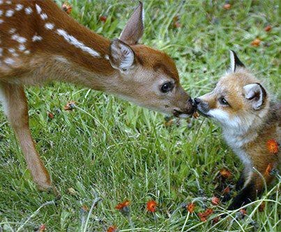 《癒されたらシェア》さんからシェアしました。 お互いに、子供ならではの旺盛な[好奇心]のなせる技 ほのぼのショットでも、珍しい顔合わせ《バンビ&子ギツネ》(子犬っぽく見えるかもしれませんが、キツネだそうです。) どこか、躊躇気味にも見えるし・・・純粋に?好奇心のまま、ご挨拶しているとも見えたり・・・ 文句なしに微笑ましい[1枚]をどうぞ・・・
