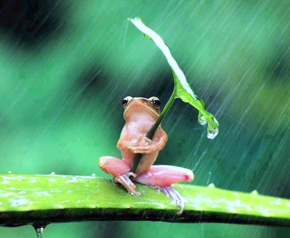 《癒されたらシェア》さんからシェアしました。 この時期ならではの、可愛らしい1枚を・・・ 結構強い雨の中で、アロエ?に見える?枝の上で、たたずむ《カエル》子供なんでしょうか・・・ しかし、体のサイズからすると、大きい葉っぱで雨宿り。。。 教えられるわけもなく、自分で見つけてでしょうが・・・エラいというか・・・ 賢い ナイスチョイスです 必死に葉っぱの重さと雨に耐えている、健気さが愛らしいチビ君の《奮闘》を・・・