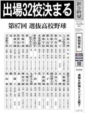 「第87回センバツ高校野球大会」 (3月21日~)出場32校が発表された 激戦とされた,関東・東京の6校目は二松学舎大付(東京)近畿6校目は近江(滋賀)中国・四国5校目は米子北(鳥取)九州4校目は九産大九州(福岡)が選ばれた 21世紀枠は3校。。。 球春の甲子園の顔ぶれです。。。去年の優勝は,龍谷大平安。。。【北海道】東海大四【東北+神宮枠】仙台育英(宮城)大曲工(秋田)八戸学院光星(青森)【関東・東京】浦和学院(埼玉)木更津総合(千葉)常総学院(茨城)健康福祉大高崎(群馬)東海大菅生/二松学舎大付(東京)【東海】静岡(静岡)県岐阜商(岐阜)【北信越】敦賀気比(福井)松商学園(長野)【近畿】天理(奈良)立命館宇治(京都)龍谷大平安(京都)大阪桐蔭(大阪)奈良大付(奈良)近江(滋賀)【中国・四国】宇部鴻城(山口)岡山理大付(岡山)英明(香川)今治西(愛媛)米子北(鳥取)【九州】九州学院(熊本)糸満(沖縄)神村学園(鹿児島)九産大九州(福岡)【21世紀枠】豊橋工(愛知)松山東(愛媛)桐蔭(和歌山)