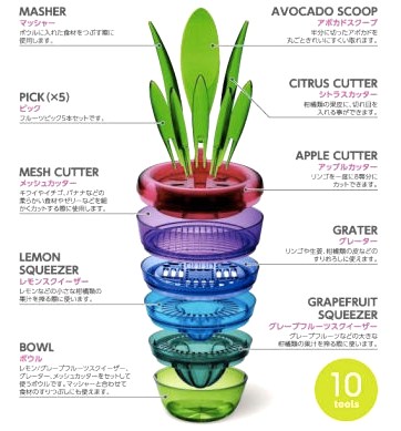「1台 10役」の便利ツールです。。。 小さな鉢植えの様な外見は置いておくだけでもキュートですリンゴを切ったり、レモンを絞ったり、10通りものツールとして使えるスグレモノ。。。 シトラスカッター、マッシャー、アボカドスクープ、ピック×5本スタンド、アップルカッター、メッシュカッター、クレーターレモンスクイーザー、グレープフルーツスクイーザー、ボウル 1人暮らしにも,プレゼントにもお手頃値段かと。。。 FRUITS PLANT(フルーツプラント) CH-2009/曙産業/果物ナイフ/送料無料FRUITS PLANT(フルーツプ...価格:5,130円(税込、送料込)