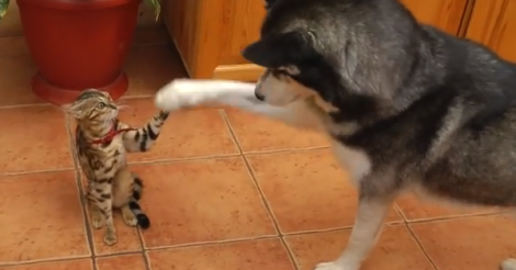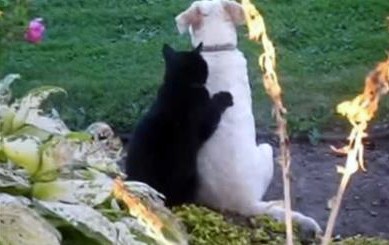 晴れとは言えど,,, 強風が半端ない1日でした。。。明日も,日がな強風の様子ですので・・・ご注意の上お過ごしください。。。 《癒されたらシェア》さんからシェアしました。 見事な切り取りのひとコマです。。。 先輩ワンコが,おふざけ気味に?ちゃちゃを入れようとした瞬間・・・ 後輩ネコ君が,ガードしたようにも見えますが・・・ ビックリまなこのネコ君の表情との合わせ技で。。。