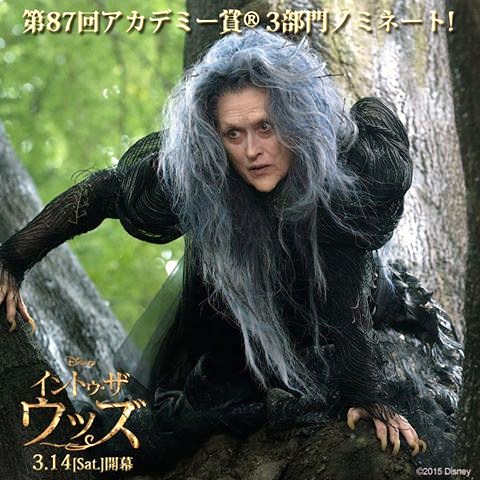 大女優は凄いというのを実証するようなポスターですが・・・ メリル・ストリープです。。。 3月14日ディズニー映画『イントゥ・ザ・ウッズ』が公開 あるパン 屋の夫婦は魔女にかけられた呪いのせいで子供を授かる事が出来ない。 子供を授かりたいと願うヒロインは呪いを解く為に必要とされるミルクのように白い牛,赤い頭巾,黄色い毛,金色の靴を得る為に森の中に入って行く。 その森の中で、シンデレラや赤ずきん、ジャックと豆の木、ラプンツェルなど、様々な童話の人物と出会う...。 童話の人気キャラクターのその後を描いた同名ミュージカルの実写映画化 監督を務めるのは『シカゴ』のロブ・マーシャル。ヒロインに『オール・ユー・ニード・イズ・キル』などで注目を浴びるエミリー・ブラント、赤ずきん役にリラ・クロフォード魔女にメリル・ストリープ,狼男はジョニー・デップと豪華キャスト