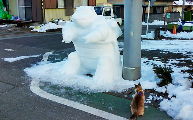 ひとケタ気温以上に,北風が体感を持っていく1日… 朝から,ガス管の入れ替え工事でにぎやかですし… 何も予算を使い切らなくてもと思うんですが!! さしずめ,ネコ君の気持ち的には...昨日と違う…でしょう 実は,一晩で雪像が進化したそうで… といっても,勝手に変化するわけもなく 毎年この場所に,雪像を設置される方がいらっしゃるそうで 完成度の高さが半端なく,彼のバックショットとの対比が 変化の度合いと一緒に…