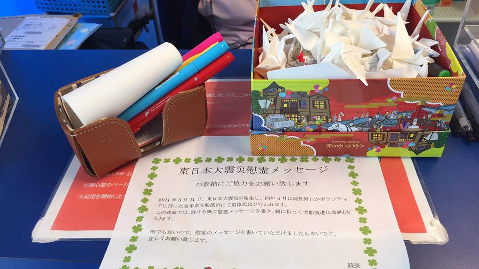 3/11,大船渡市にて東日本大震災の追悼式典が行われます。 この式典では,水に溶ける紙に慰霊メッセージを書き鶴に折って大船渡港に奉納(流)します。 実は,順心堂院長の野口君が6年前に災害ボランティアへ伺いマッサージや清掃作業のお手伝いなどを地でもありご縁のある地という事でのお知らせです。 この時に,僅かながらの衣類を出させて頂きましたが 亡くなった方を忘れない為にも,震災があった事を忘れない為にも,少しでも多くの方に慰霊メッセージを書いて頂きたく順心堂でも今週一杯までこの慰霊メッセージを承っております。 メッセージは,先日のようがこども食堂の開催時にも置かせて頂いたのですが意外にも子供達が積極的に書いてくれていることに驚いています。 中には,当時2~3歳?と殆ど記憶には無い子達も。 『亡くなった人に何て書けばいいんだろう?』と言いながら彼らなりの言葉でメッセージを書いてくれているようですと… 6年目を前にしての知人の行動の一端をと