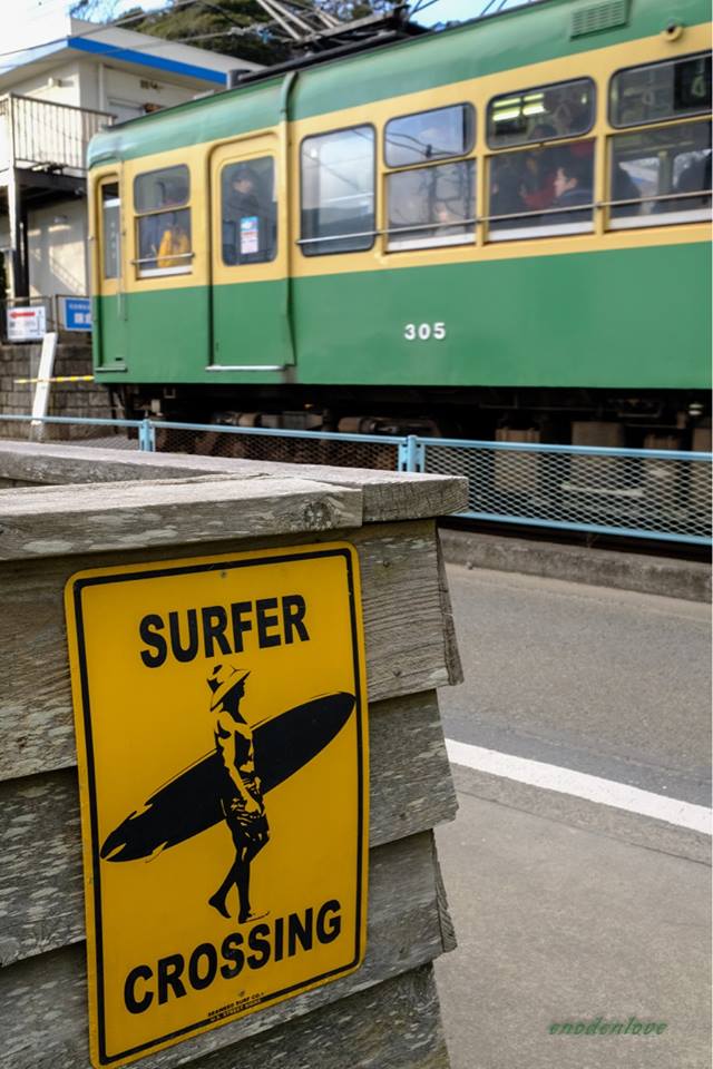 強風といってもこれほどとは… 8m超えての春2番になり,ポツポツと小雨… 体調管理にご留意を!! 警告看板に,ローカル色豊かなのはいくつか見ますが… 湘南色満載の一枚… 以前,サーファーが踏切を渡るショットはご紹介しましたが この看板は知りませんでした デザインもおしゃれでリアル… そこでの江ノ電とのコラボは秀逸と…