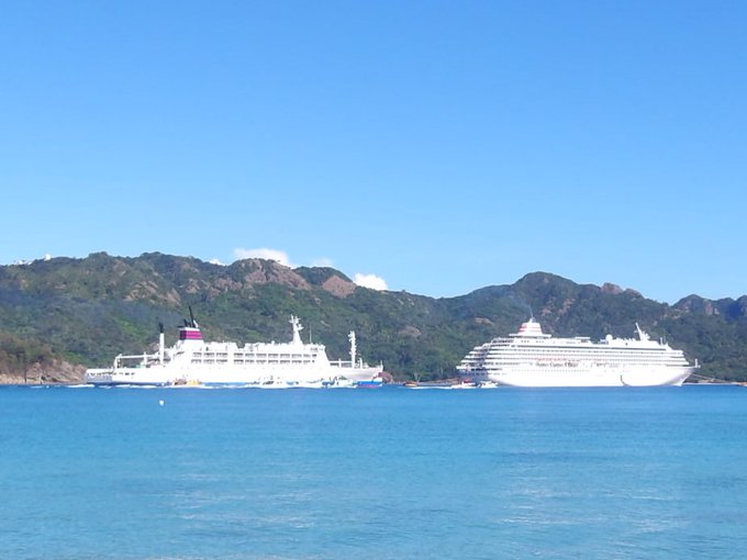 36.8度まで上がりましたが…明日は一段上がる予報。熱中症対策にもご注意の上で体調管理にご自愛ください。 小笠原ビジターセンターから~5年ぶりに,飛鳥ll が二見港に入港折り返し運行中のおがさわら丸と並んで停泊の貴重な光景が実現いつも通り,漁船などにお見送りされ一足早い,おがさわら丸の出港時は船体がすっぽりと,飛鳥の中に…当然と言えばですが貴重な1枚