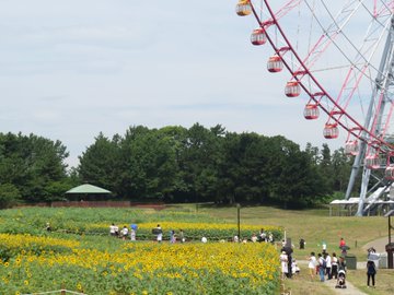 都内は38度に…明日も熱中症危険警戒レベル。紫外線対策にもご注意の上でご油断なくお過ごしください。 葛西臨海公園~~夏の花ヒマワリが満開植栽の工夫で,来月から入れる場所もあり…観覧者の下のヒマワリ畑は黄色一色の世界冷房完備の観覧者に乗って上空からも楽しめます