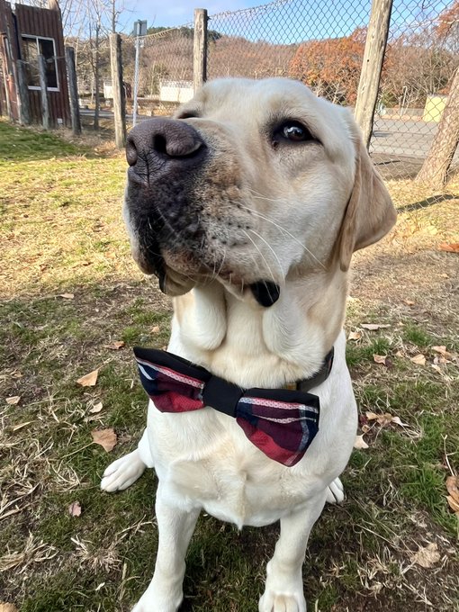 予報通りの10度。防寒対策にご留意の上暖かくしてお過ごしください。 姫路セントラルパーク~~ドッグエリアから…ラブラドルレトリバーのニコちゃん昨日,2歳の誕生日を迎えたそうでサイズが若干大きめの赤と黒の蝶ネクタイを着けて記念写真日陰ですが眩し気な表情?
