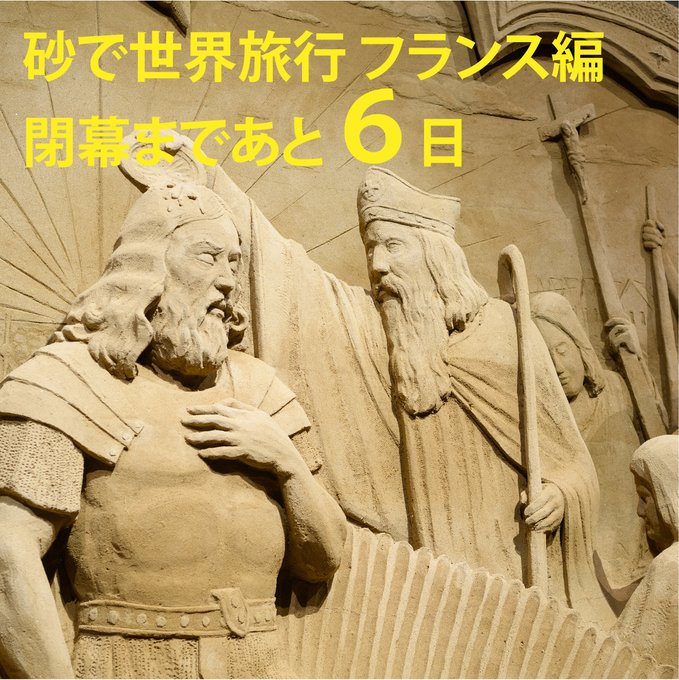 予報通りの10度の晦日。インフルエンザ対策にご注意でご油断なくお過ごしください。 砂の美術館~~4月から始まった『フランス編』1/5までのあと6日になりました。国王・クローヴィスがキリスト教に改宗する場面の砂像この後,フランク王国とローマ帝国が結びつきを深め,強国になっていく歴史的な場面を表現
