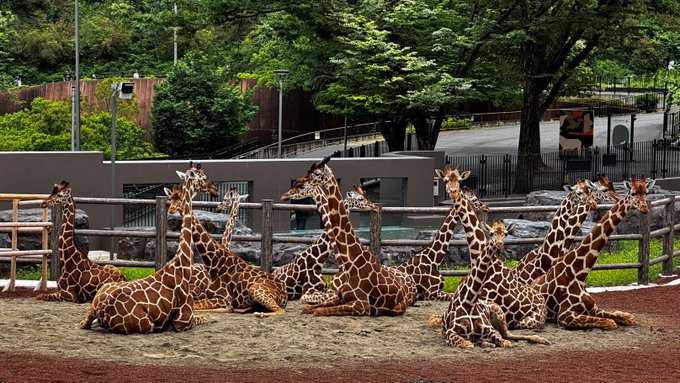 陽射しのないまま21度。明日以降天候回復予報ですが体調管理にご自愛ください。 多摩動物公園~~滅多に見られない集合写真最近,キリンたちのお気に入りの砂場だそうで…新しく砂を入れ替えてサラサラ肌触りが良いのでしょうか13頭全員でお座りリラックス