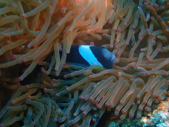 曇天で24.1度。明日の本降り予想にご注意の上で十二分にご注意下さい。 小笠原ビジターセンターから~父島周辺の海底の一コマイソギンチャクから顔を出しているのは,クマノミただ,小笠原のクマノミはニモのイメージのオレンジ柄ではなく…独特のブルーラインだそうで自然界のデザイナーのセンスはいつもながら感心します